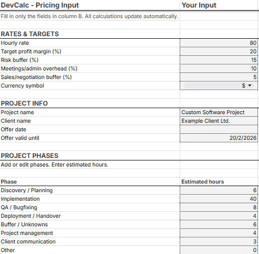 DevCalc is a Google Sheets pricing calculator designed for fixed-price freelance work.Instead of guessing a number, you calculate a base cost, add explicit buffers, and apply profit on top — transparently and consistently.